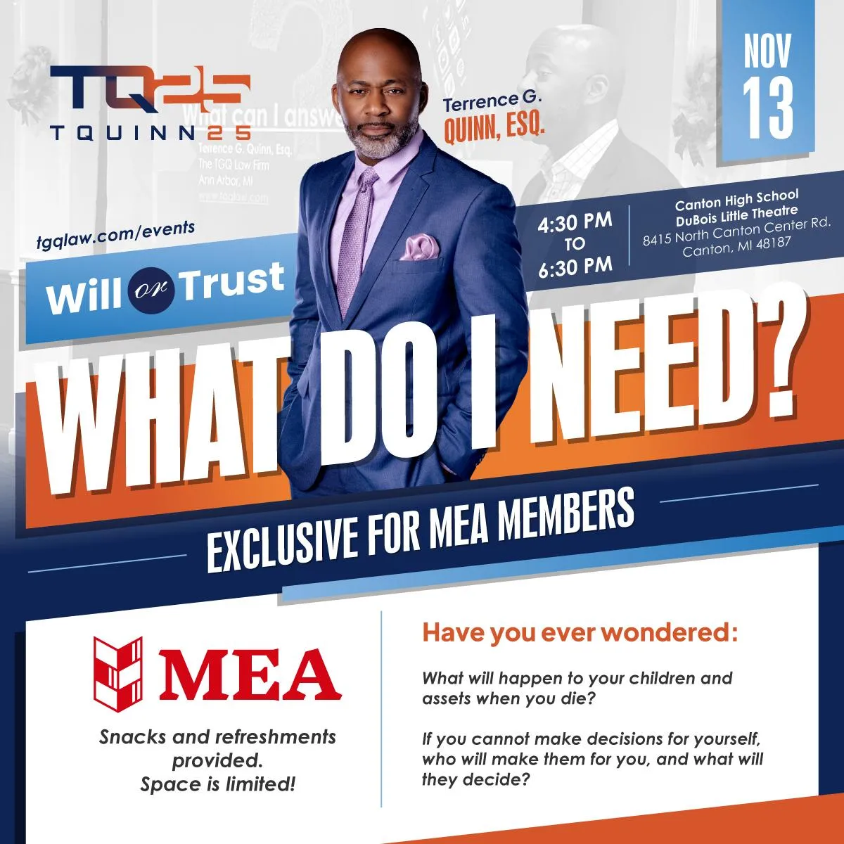 In 2008, he founded his firm, the Law Office of Terrence G Quinn, PLC, now called The TGQ Law Firm. With his signature diligence and grit, Terrence assists Michigan clients with legal assistance to help them find comfort in what lies ahead.